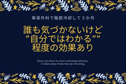 8月の終わりに美容外科で脂肪冷却の施術を受けた。20%の皮下脂肪が落ちるとの触れ込みです。信じるものは救われる! 3か月たったので経過・結果・感想、その後得た知見など。